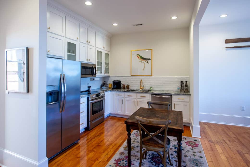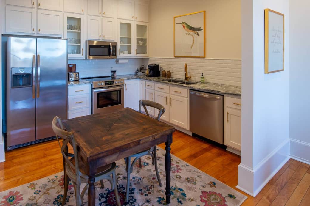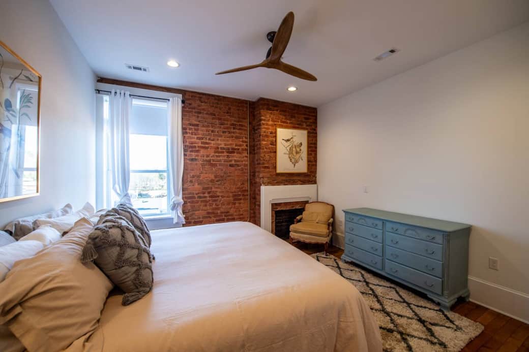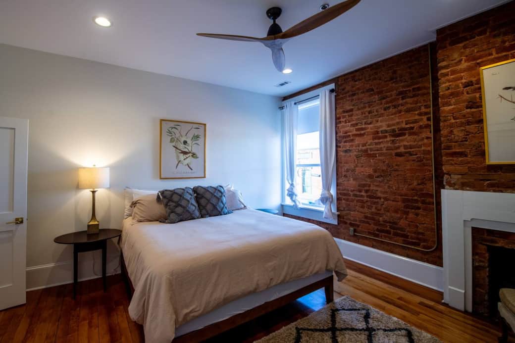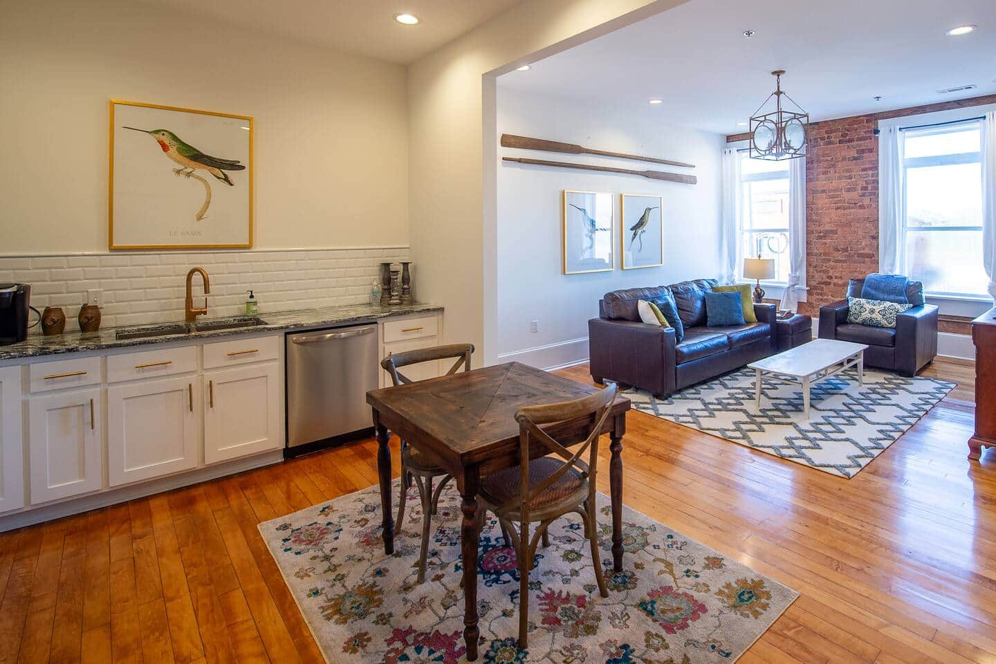 Charming downtown loft featuring exposed brick walls, warm hardwood floors, and large windows that fill the space with natural light. The comfortable living area includes a leather sofa, cozy armchair, and smart TV—perfect for relaxing after a day exploring Seneca or attending a Clemson game. One bedroom Suite located just steps from Ram Cat Alley’s restaurants and shops and only minutes from Clemson University, this loft offers the perfect blend of character, comfort, and convenience.